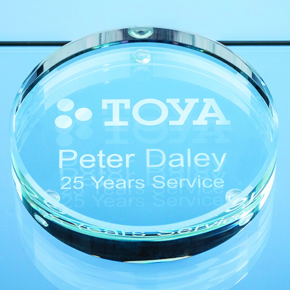 The 9cm round clear glass paperweight is fantastic value for money and has the benefit of being able to be decorated using a variety of different techniques including sandblast engraving, sub surface engraving or full colour printing.