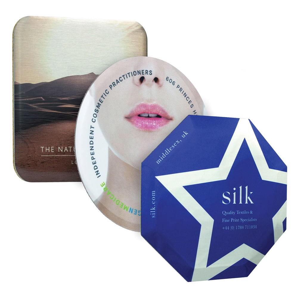 Aluminium coasters with cork backing. 4 standard shapes/sizes to choose from. 89mm round or square, 94mm hexagon or 90mm octagon. Full colour print.
