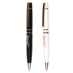 The Duke Rose Gold Ball Pen from the Prestige Pens collection is a refined writing instrument designed to make an impression. Featuring a polished stainless steel barrel with luxurious gold accents and rose gold engraving to match, it combines robust construction with a sleek, elegant design. The twist-action mechanism ensures smooth and reliable operation, while the glossy finish adds to its premium appeal. Ideal for engraving with a name or logo, the Duke Rose Gold Ball Pen is a perfect choice for executive gifts, high-end promotions, or client presentations. Available in classic finishes this pen brings a timeless look with a touch of prestige. Order now to showcase your brand with classic gold styling.